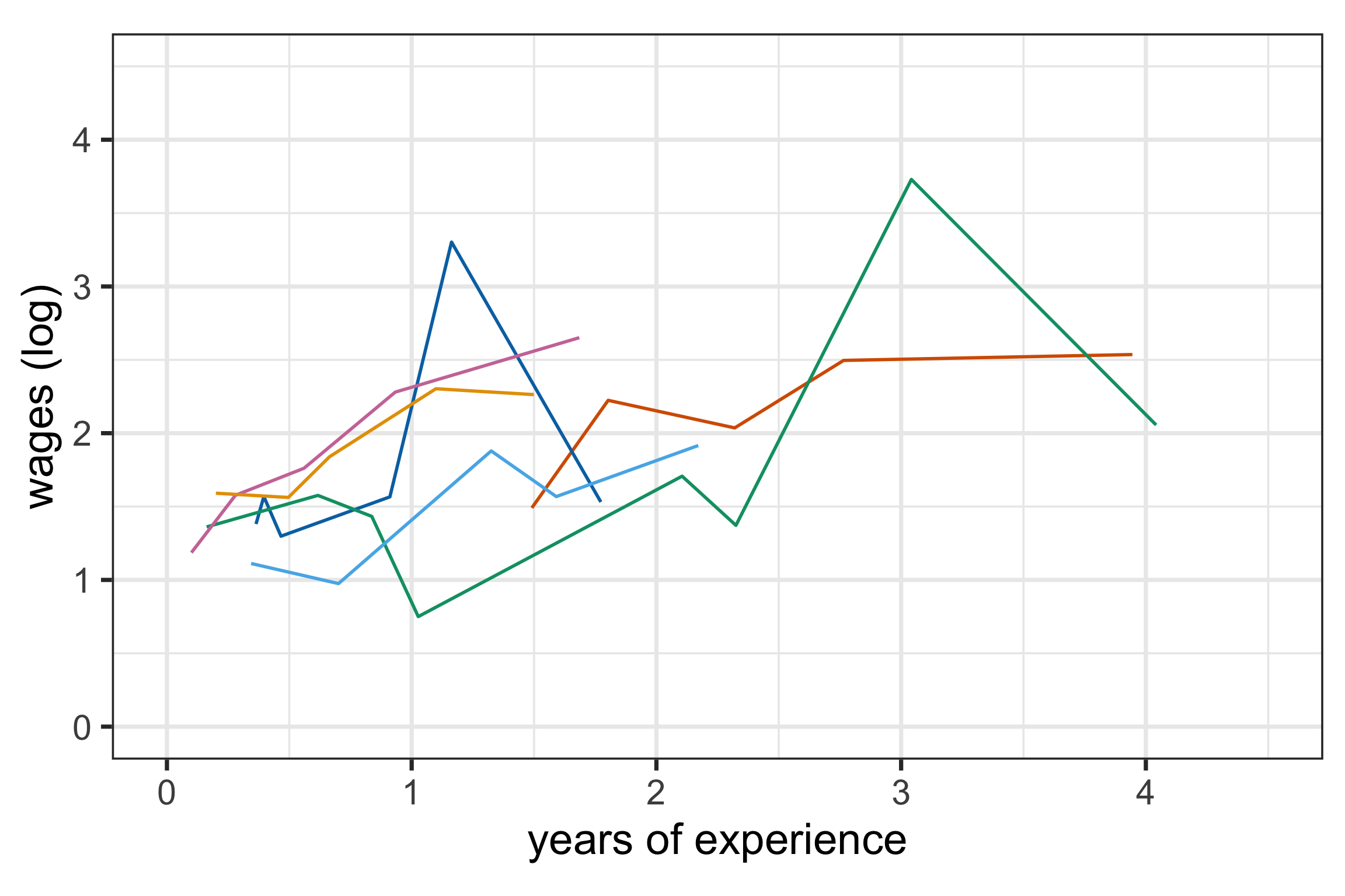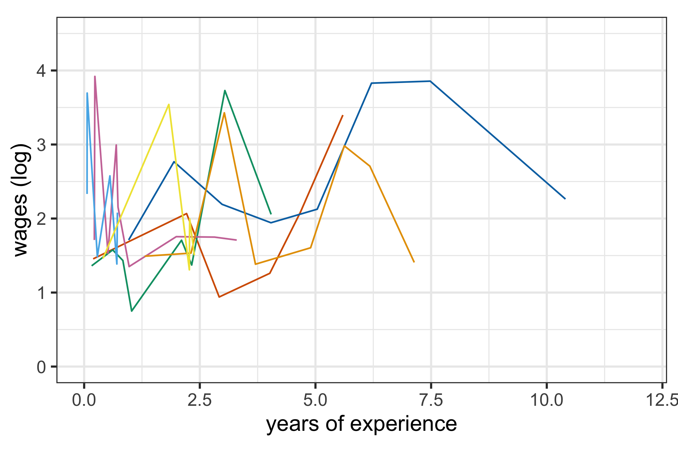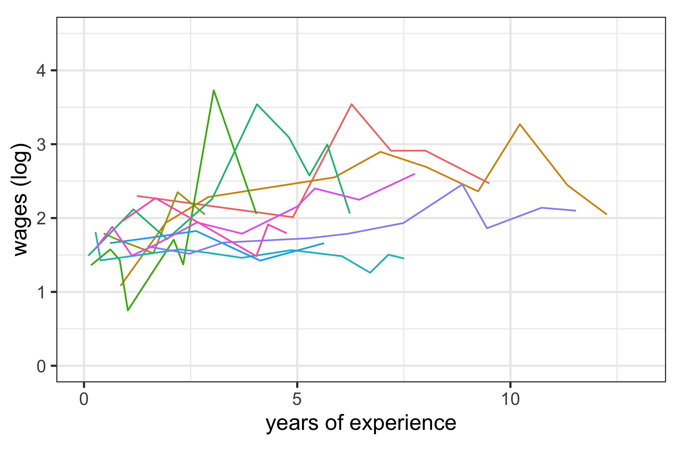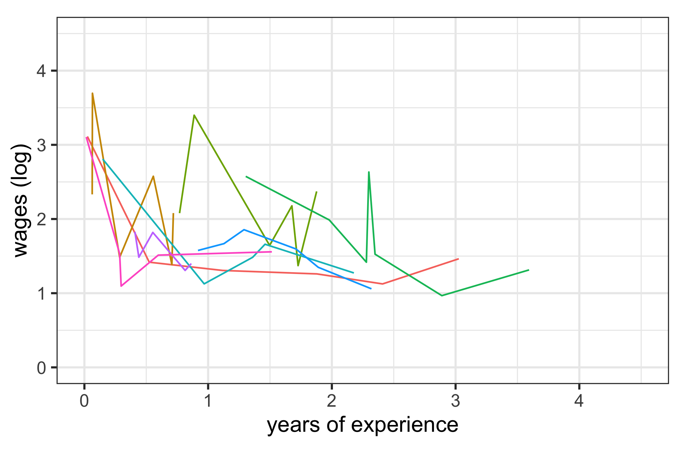 geom_line(aes(x = xp, y = ln_wages, group = id), alpha=0.1) +