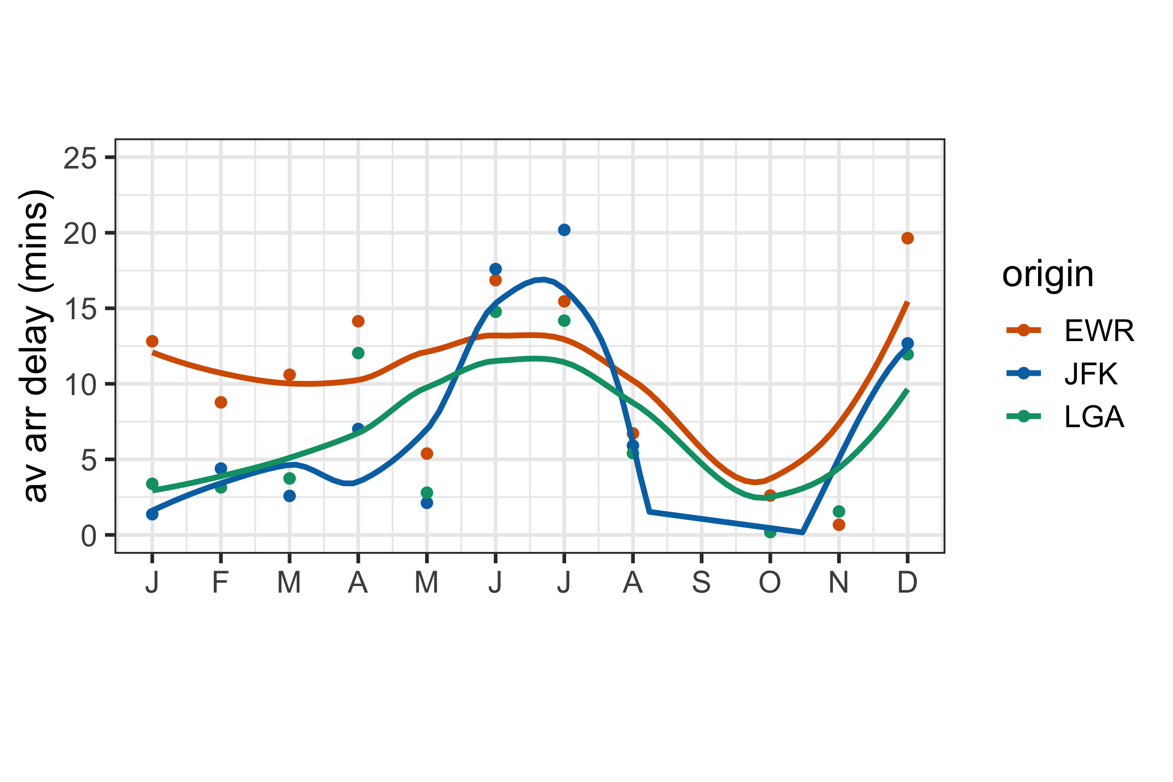 ggplot(flights_mth, aes(x=month, y=dep_delay, colour=origin)) +