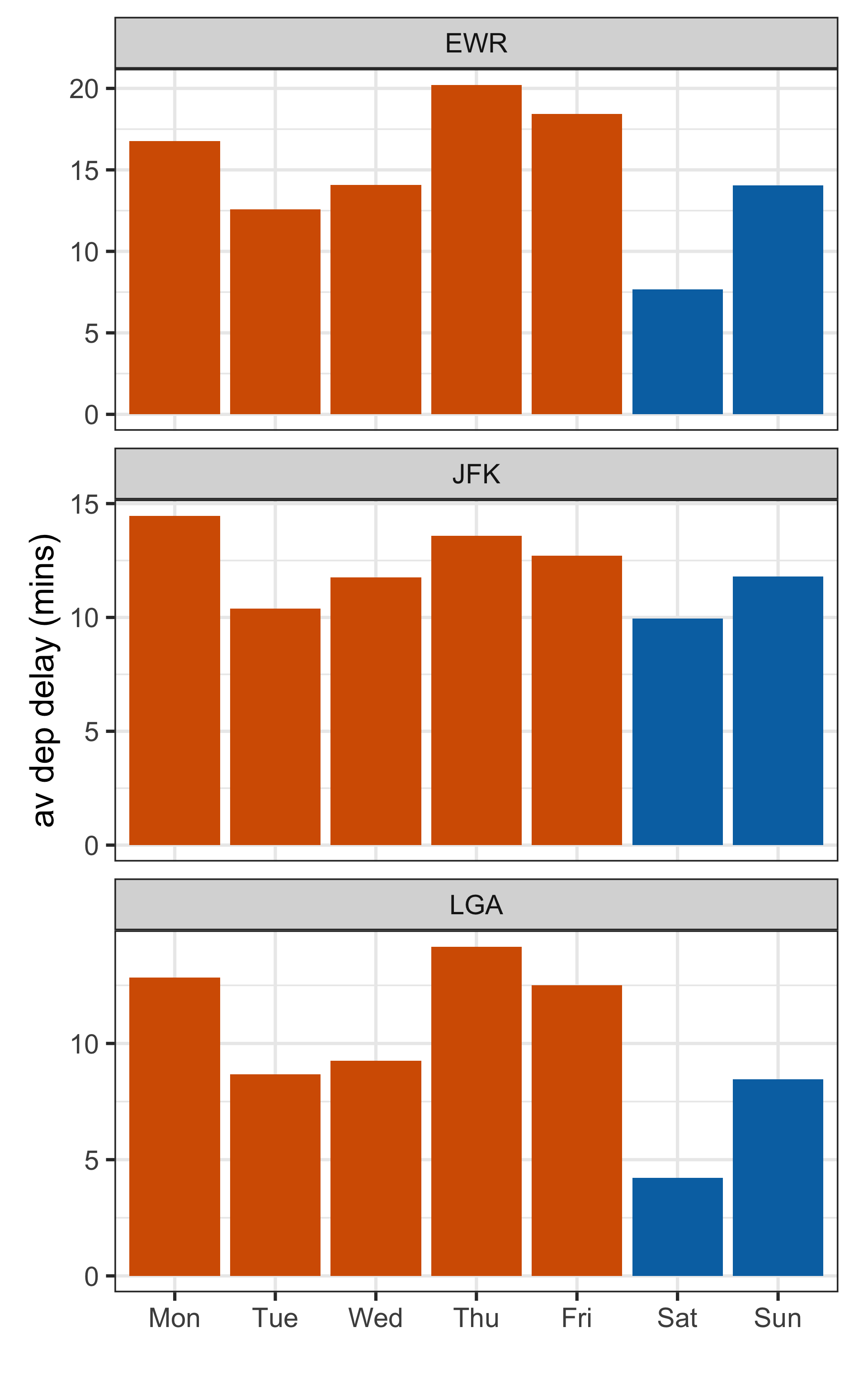 The US flights data already has some temporal components created, so aggregating by these is easy. Here is departure delay.